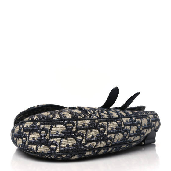 This is an CHRISTIAN DIOR Oblique Mens Saddle Bag in Blue. This saddlebag is made of blue on beige Dior monogram canvas. The bag features an adjustable jacquard shoulder strap, blue calfskin leather trim, and a CD buckle. The flap of the bag opens to reveal a silver zipper top that opens to a blue fabric interior.