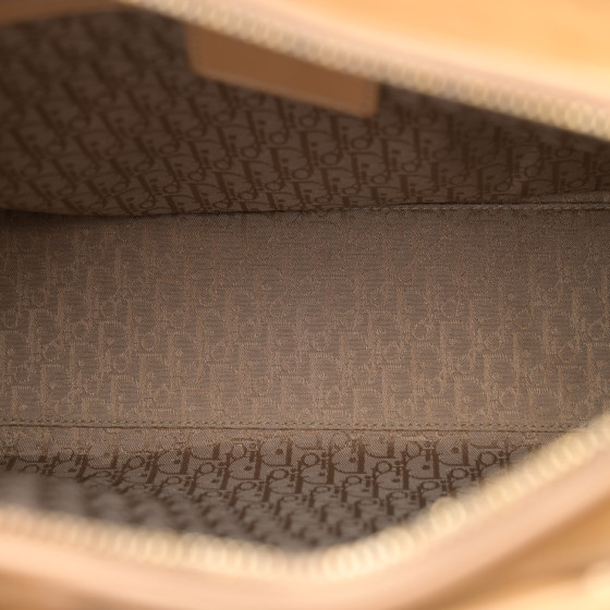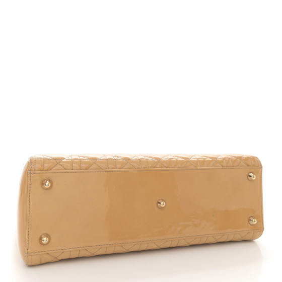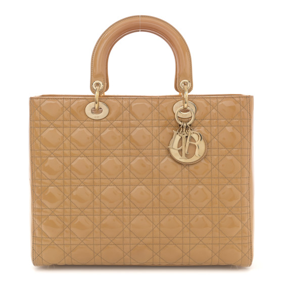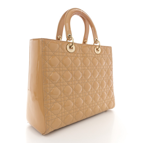 This is an CHRISTIAN DIOR Patent Cannage Large Lady Dior in Beige. This chic tote is crafted of quilted patent leather in beige. The shoulder bag features top handles, and an optional shoulder strap with light gold hardware including Dior letter charms. The top zipper opens to a beige logo jacquard fabric interior with a zipper pocket.