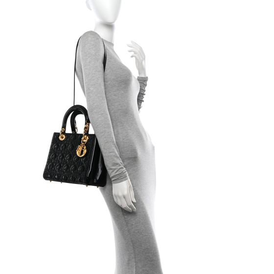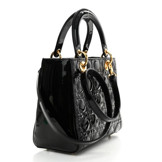This is an CHRISTIAN DIOR Patent Cannage Medium Lady Dior in Black. This chic tote is crafted of geometric quilted patent leather in black. The handbag features an optional adjustable shoulder strap, sturdy patent leather top handles with gold hardware, and hanging Dior logo charms. The top zipper opens to a gray monogrammed fabric interior with a zipper pocket.