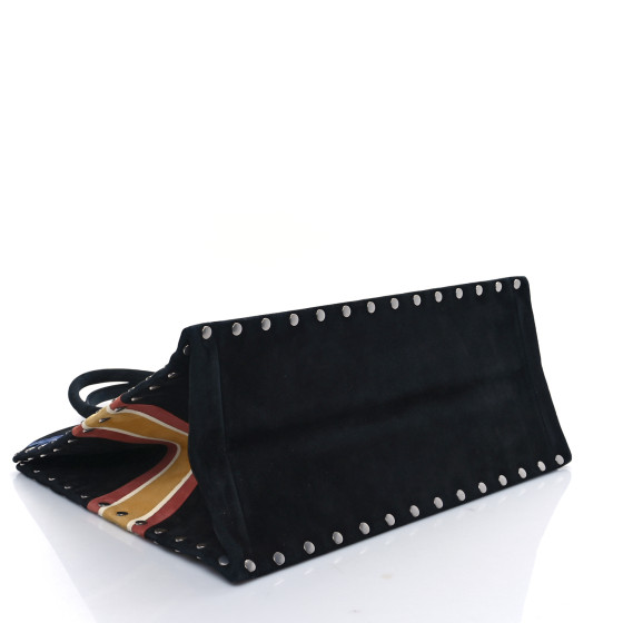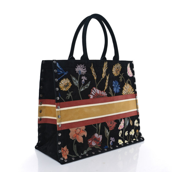 This is an CHRISTIAN DIOR Suede Floral Hand Painted Large Book Tote in Black. This tote is finely crafted of black suede leather with a bold intricate design. The bag features matte silver studs, matching rolled handles, and the CHRISTIAN DIOR logo embroidered across the front. The bag opens to a spacious black suede interior.