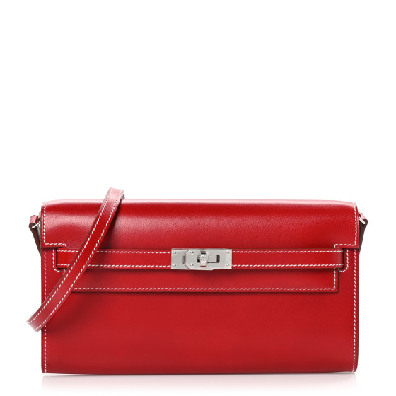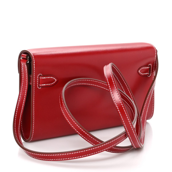 This is an authentic HERMES Box Kelly Wallet To Go Rock in Rouge Piment. This chic wallet bag is crafted of smooth box calfskin leather in red. The wallet features a front flap, optional thin leather crossbody strap, and a shorter studded leather shoulder strap. The crossover flap opens with a signature Kelly palladium-plated turn-lock to a partitioned red leather interior with card slots and a zipper pocket.