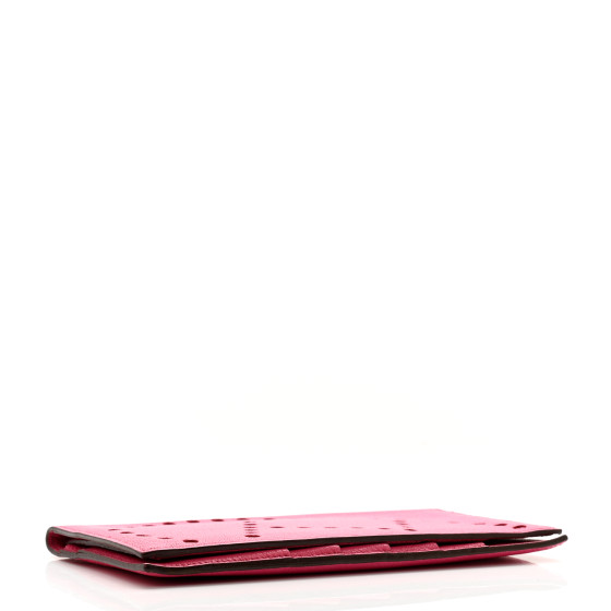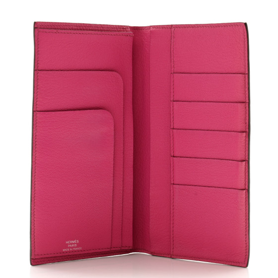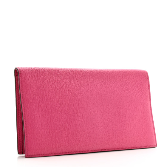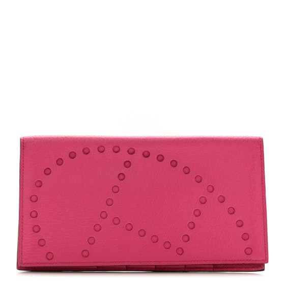 This is an HERMES Chevre Mysore Evelyne Long Wallet in Rose Tyrien. This chic clutch wallet is crafted of luxuriously textured chevre goatskin leather in pink. The wallet opens with a palladium silver zipper to a matching leather interior with card slots, patch pockets and a full zipper compartment.