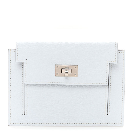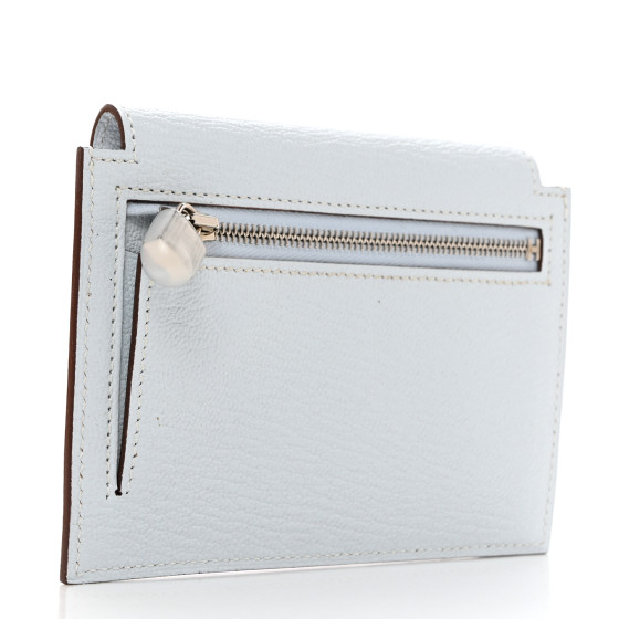 This is an authentic HERMES Chevre Mysore Kelly Pocket Compact Wallet in Bleu Brume. This stunning clutch wallet is finely crafted of grained pastel blue goatskin leather. The wallet features a rear zipper pocket and palladium silver hardware. The turn lock opens to a matching leather interior.