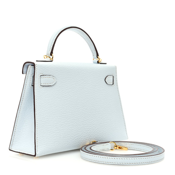 This is an authentic HERMES Chevre Mysore Mini Kelly Sellier 20 in Bleu Brume. This stunning Hermes classic handbag is beautifully crafted in light blue goatskin leather. A single rolled leather top handle is secured with permabrass hardware and an optional leather shoulder strap is included. The traditional Kelly turn lock secures the small flap and opens to a matching chevre goatskin leather with a single flat pocket.
