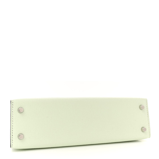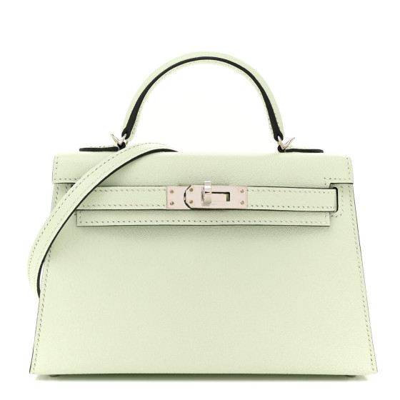 This is an authentic HERMES Chevre Mysore Mini Kelly Sellier 20 in Vert Fizz. This Hermes classic handbag is crafted in goatskin leather in light green. A single rolled leather top handle is secured with silver palladium plated hardware and an optional leather shoulder strap. The traditional Kelly turn lock secures the small flap. The interior features a matching chevre goatskin leather with a single flat pocket.