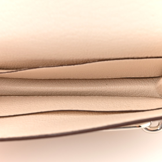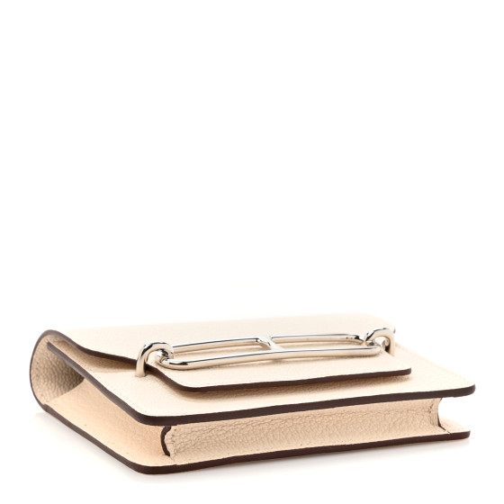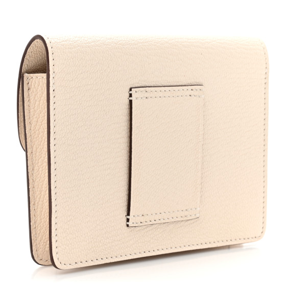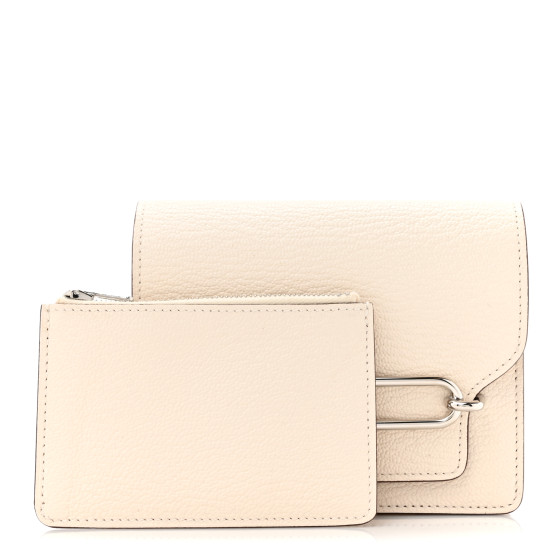 This is an HERMES Chevre Mysore Roulis Slim Wallet in Nata. This compact essential wallet is crafted of goatskin leather in off white and features a frontal silver plated H clasp that opens to a matching leather interior with card slots and a removable zipper pocket insert.