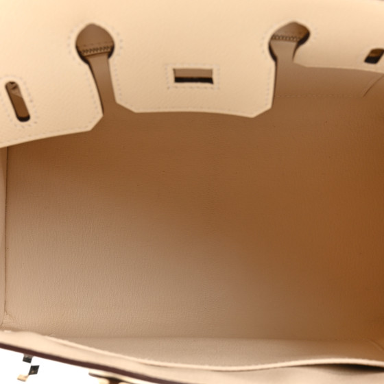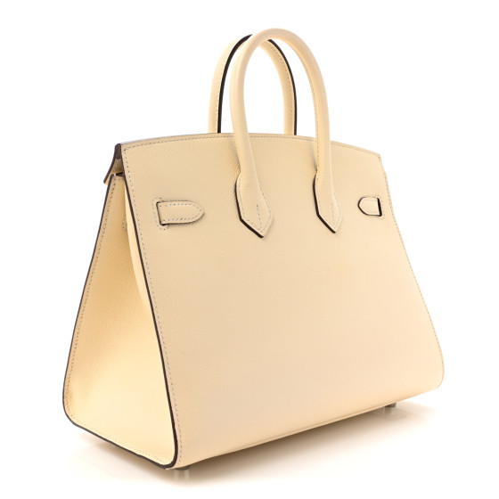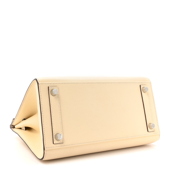 This is an authentic HERMES Epsom Birkin Sellier 25 in Nata. This rare Sellier model is expertly constructed of epsom calfskin leather in beige. This bag features rolled leather top handles, a front flap, strap closure and gold plated hardware including a gold turn lock, a padlock and a clochette for 2 keys. This opens to a matching chevre goatskin leather interior with pockets.