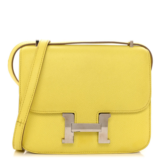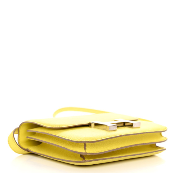This is an HERMES Epsom Constance 18 in Lime. This is a chic small bag that is finely crafted of luxurious epsom calfskin leather in yellow. The bag features a leather cross body shoulder strap, expandable sides, a facing flap, and palladium silver-plated Hermes H logo. The flap opens to a partitioned smooth matching leather interior with a pocket.