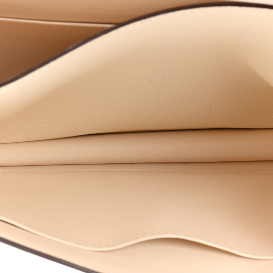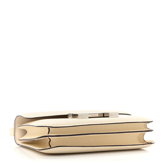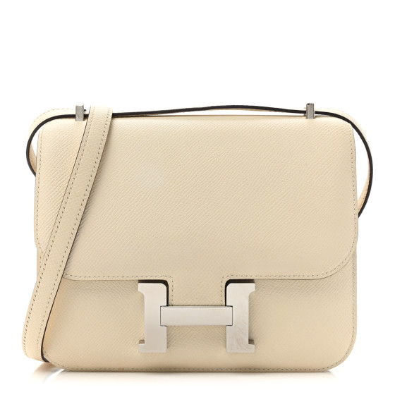 This is an HERMES Epsom Constance 18 in Nata. This is a chic small bag that is finely crafted of luxurious epsom calfskin leather in off white. The shoulder bag features a leather cross body shoulder strap, expandable sides, a front flap and a palladium silver Hermes H logo. The flap opens to a partitioned matching leather interior with patch pockets and a mirror.