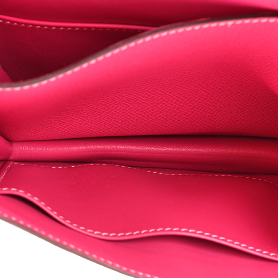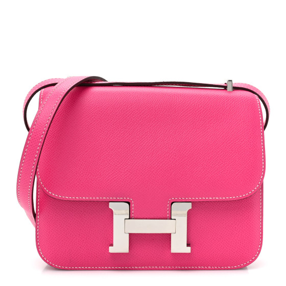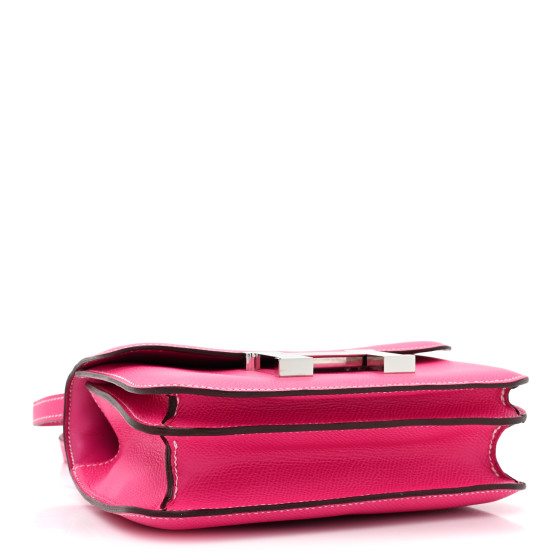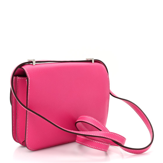 This is an HERMES Epsom Constance 18 in Rose Tyrien. This is a chic small bag that is finely crafted of stamped epsom calfskin leather in bright pink. The bag features a leather cross body shoulder strap, expandable sides, a frontal flap and a palladium Hermes H logo. The flap opens to a partitioned matching lambskin leather interior.