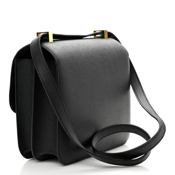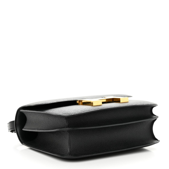 This is an HERMES Epsom Constance 24 in Black. This stylish shoulder bag is finely crafted of epsom calfskin leather in black. The bag features a cross-body strap with gold plated hardware including an H buckle at the front flap. The flap opens to a compact partitioned black leather interior with flat and zippered pockets.
