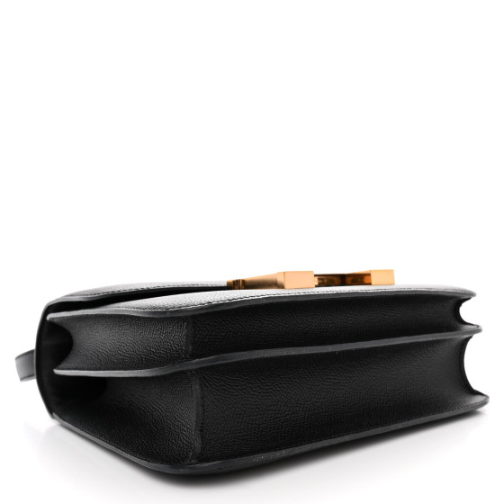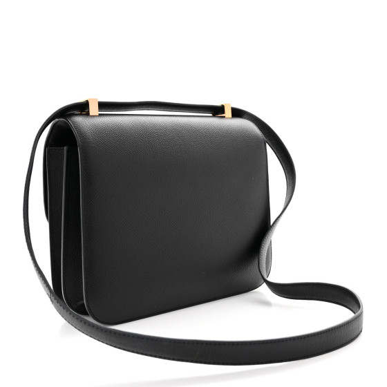 This is an HERMES Epsom Constance 24 in Black. This stylish shoulder bag is finely crafted of epsom calfskin leather in black. The bag features a cross-body strap with rose gold plated hardware including an H buckle at the front flap. The flap opens to a compact partitioned black leather interior with flat and zippered pockets.