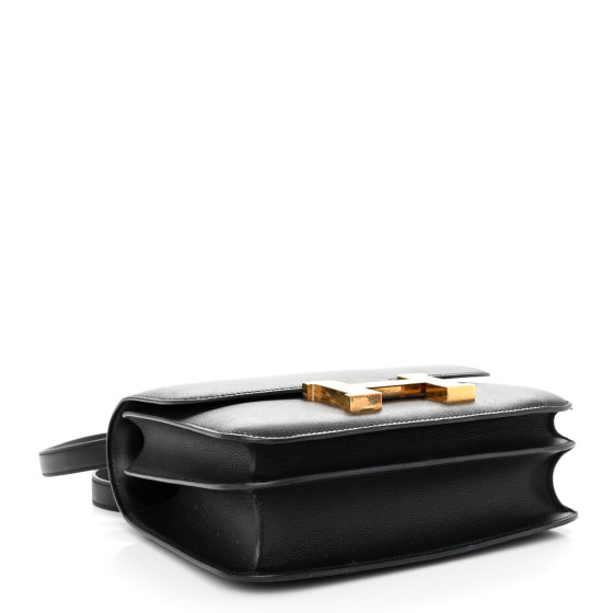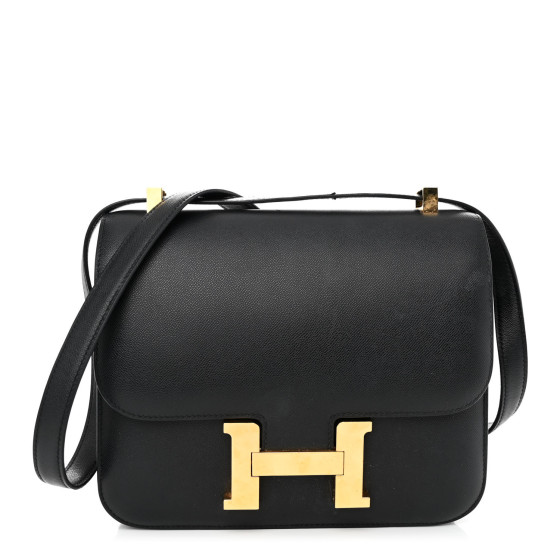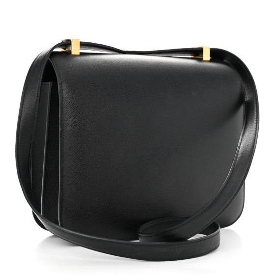 This is an HERMES Epsom Constance 24 in Black. This stylish shoulder bag is finely crafted of epsom calfskin leather in black. The bag features a cross-body strap with gold plated hardware including an H buckle at the front flap. The flap opens to a compact partitioned black leather interior with flat and zippered pockets.