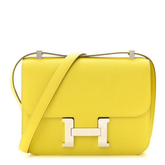 This is an HERMES Epsom Constance 24 in Lime. This stylish shoulder bag is finely crafted of epsom calfskin leather in yellow. The bag features a cross body strap with palladium silver hardware including an H buckle at the frontal flap. The flap opens to a compact partitioned leather interior with zipper and patch pockets.