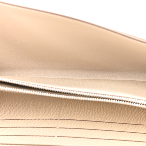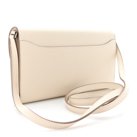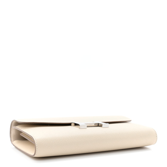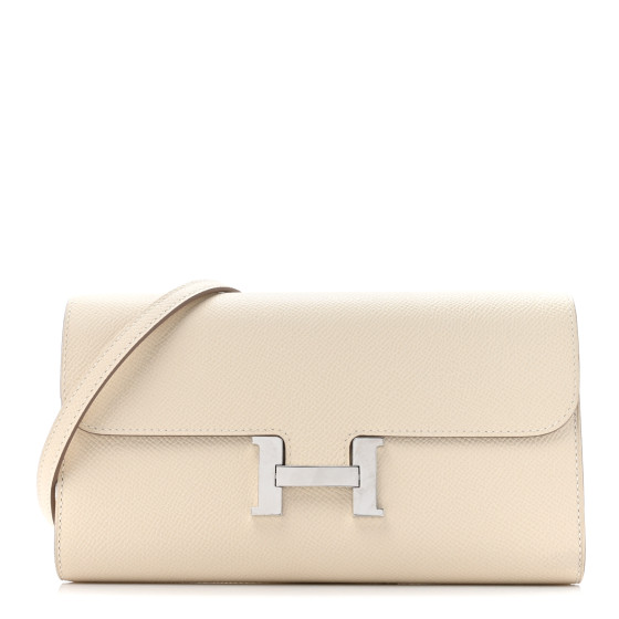 This is an HERMES Epsom Constance Long To Go Wallet in Craie. This wallet is crafted of fine Epsom calfskin leather in off white. The wallet features a front flap, a removable shoulder strap, and a rose gold Hermes H clasp. This opens to a partitioned matching leather interior with card slots, patch pockets, and a zipper pocket.