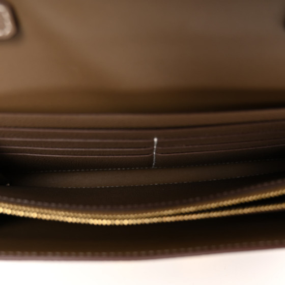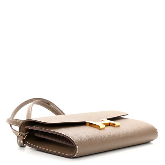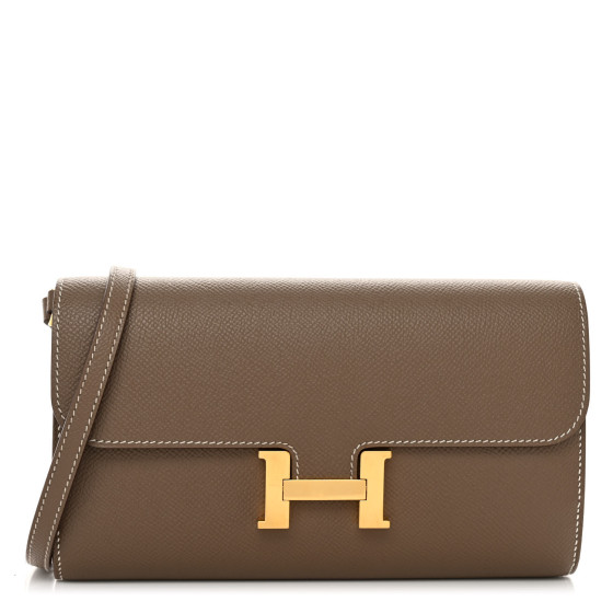 This is an HERMES Epsom Constance Long To Go Wallet in Etoupe. This wallet is crafted of fine epsom calfskin leather in taupe. The wallet features a front flap, a removable shoulder strap, and a polished gold-plated Hermes H clasp. This opens to a partitioned matching leather interior with card slots, patch pockets, and a zipper pocket.