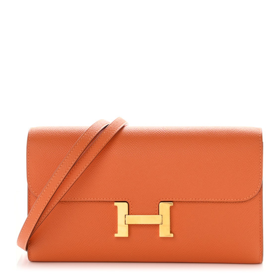 This is an HERMES Epsom Constance Long Wallet To Go Wallet in Orange. This chic wallet is crafted of fine Epsom calfskin leather in orange. The wallet features a front flap, strap, and signature H gold plated press-lock. This opens to a partitioned leather interior with card slots, patch pockets, a detachable strap, and a zipper pocket.