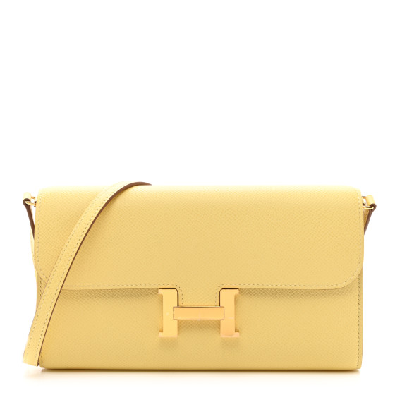 This is an HERMES Epsom Constance Long To Go Wallet in Jaune Poussin. This chic wallet is crafted of fine Epsom calfskin leather in light yellow. The wallet features a front flap, strap, and signature H gold plated press-lock. This opens to a partitioned leather interior with card slots, patch pockets, a detachable strap, and a zipper pocket.