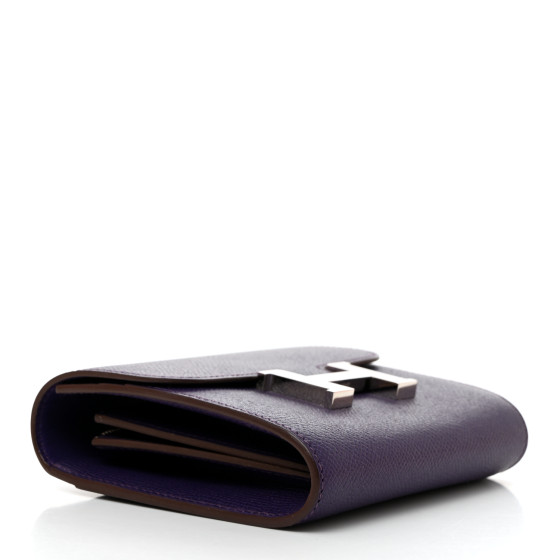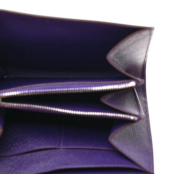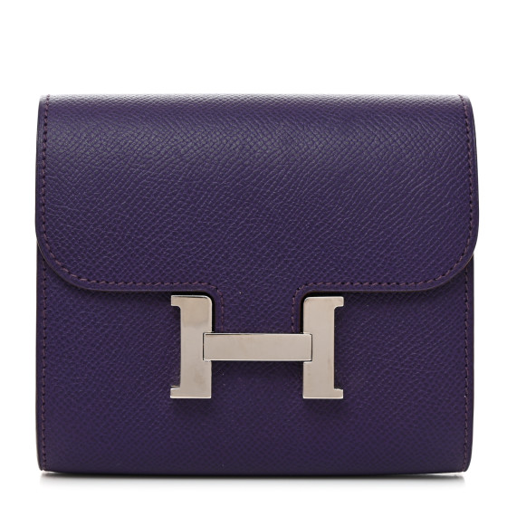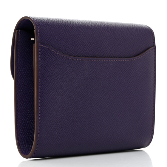 This is an HERMES Epsom Constance Short Wallet in Iris. This compact essential wallet is crafted of fine stamped leather in purple and features a palladium H closure. This opens to a smooth compact accordion style partitioned interior with card slots and a zipper compartment.