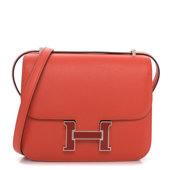 This is an HERMES Epsom Enamel Constance 18 in Capucine and Sanguine. This is a chic small bag that is finely crafted of luxurious epsom calfskin leather in red. The shoulder bag features a leather crossbody shoulder strap, expandable sides, a front flap and a polished palladium Hermes H logo with a red enameled accent. The flap opens to a partitioned matching red leather interior with patch pockets.