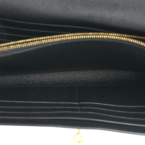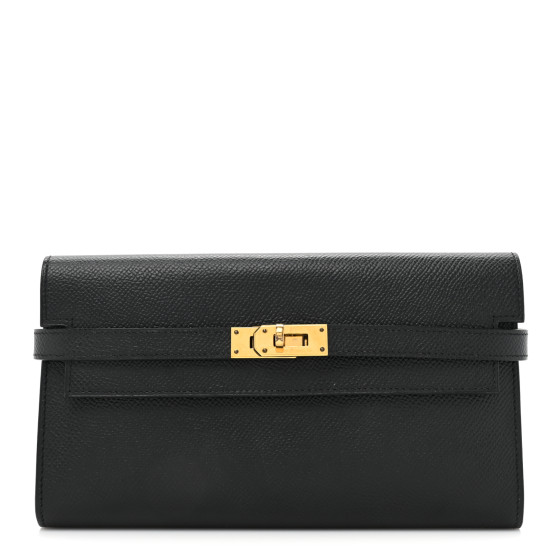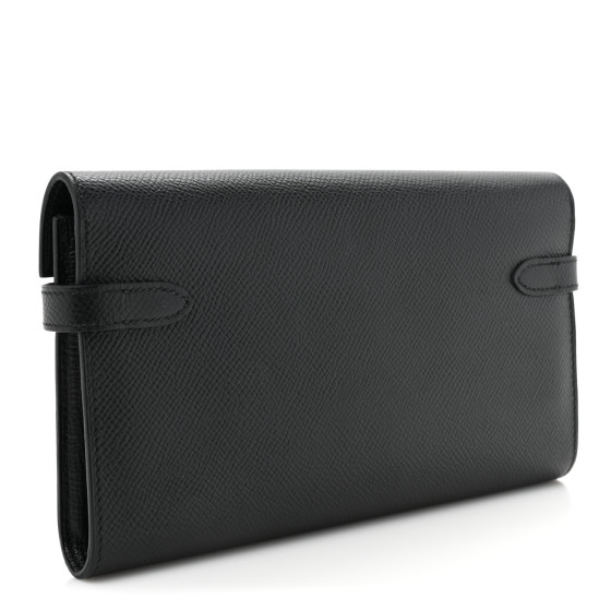 This is an HERMES Epsom Kelly Longue Wallet in Black. This stylish wallet is crafted of textured Epsom calfskin leather in black. The wallet features a flap with strap closure and a gold plated Kelly turn lock. The flap opens to a matching leather interior with two card slot panels, a zipper compartment, and patch pockets.