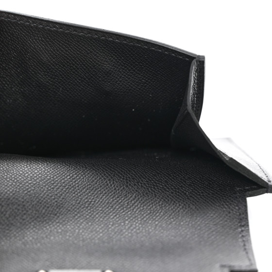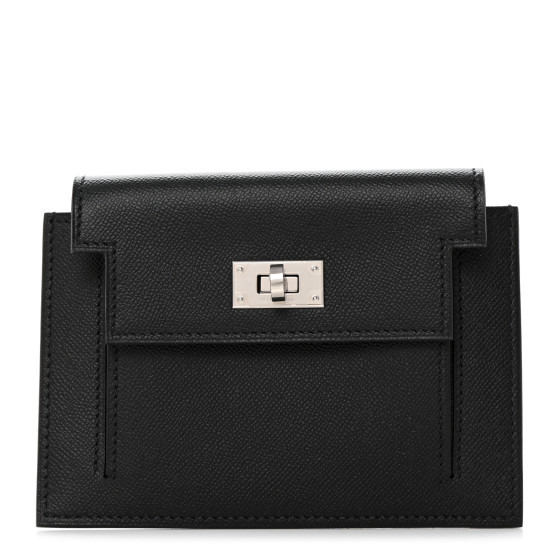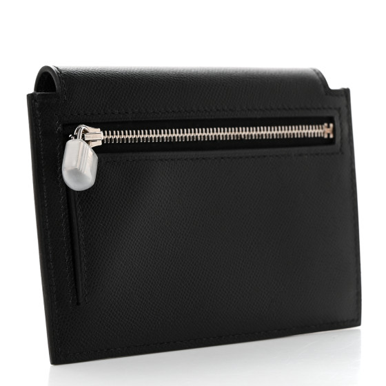 This is an HERMES Epsom Kelly Pocket Compact Wallet in Black. This stunning clutch wallet is finely crafted of epsom leather in black and features a palladium silver Kelly signature turn-lock, a rear zipper pocket, and a matching black leather interior.