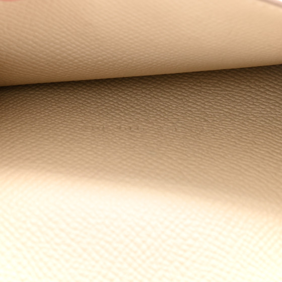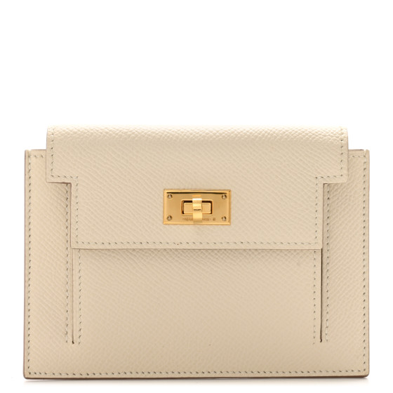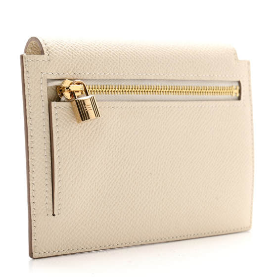 This is an HERMES Epsom Kelly Pocket Compact Wallet in Craie. This stunning clutch wallet is finely crafted of epsom leather in off white. The front flap and polished gold plated Kelly signature turn-lock opens to a matching leather interior and a rear zipper pocket.