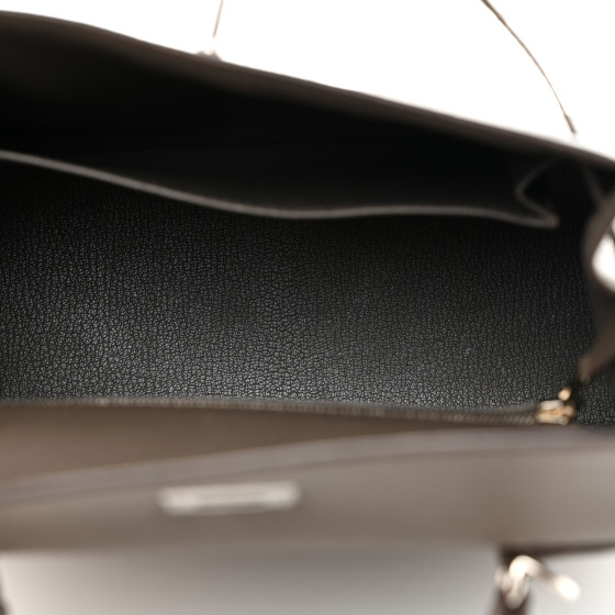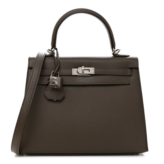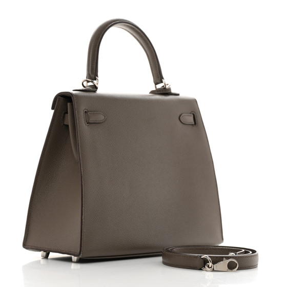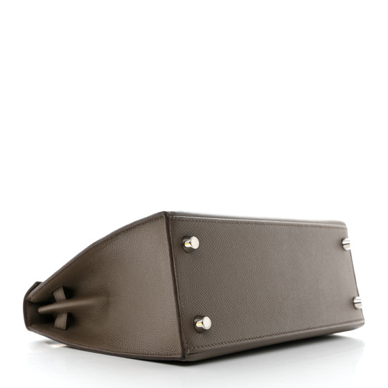 This is the authentic HERMES Epsom Kelly Sellier 25 in Etain. This classic Kelly handbag tote is crafted of luxuriously textured calfskin leather in gray. The bag features a sturdy rolled leather top handle, an optional shoulder strap, and a crossover flap and strap closure with silver palladium plated hardware including a padlock with a clochette for the keys. This opens to a matching leather interior with zippered and flat pockets.