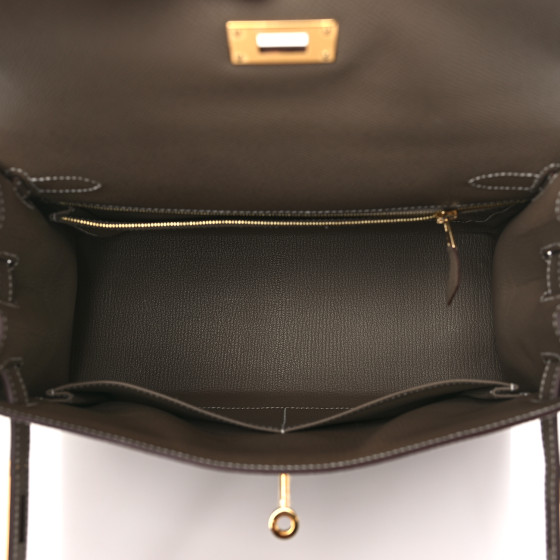 This is an authentic HERMES Epsom Kelly Sellier 28 in Etoupe. This stunning Hermes classic handbag is beautifully crafted in stamped Epsom calfskin leather in taupe. It features a rolled leather top handle and a removable strap. The traditional Kelly turn-lock secures the small flap with a padlock and a hanging leather key clochette. The flap opens to a goatskin leather interior with a zipper and patch pocket.