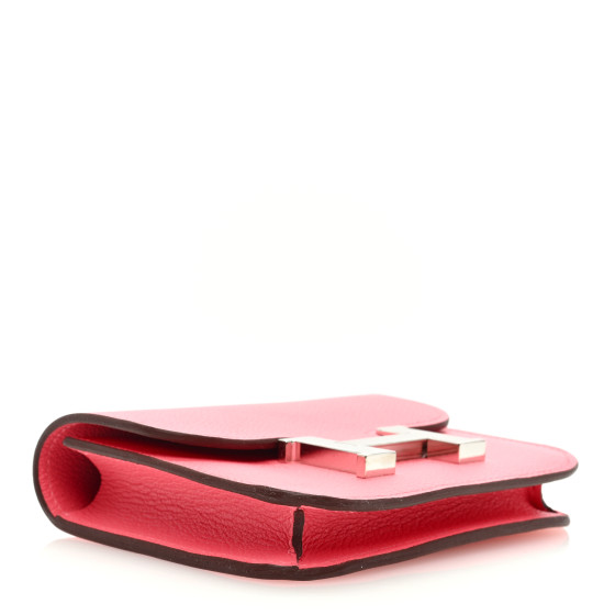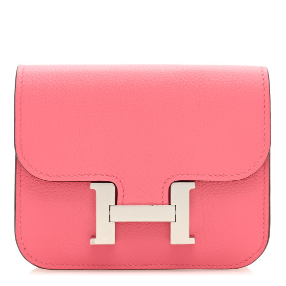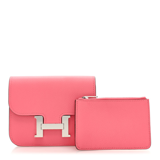 This is an HERMES Evercolor Constance Slim Wallet in Rose Lipstick. This compact essential wallet is crafted of calfskin leather in pink and features a frontal palladium-plated H clasp that opens to a matching leather interior with card slots and a pink removable zipper pocket insert.