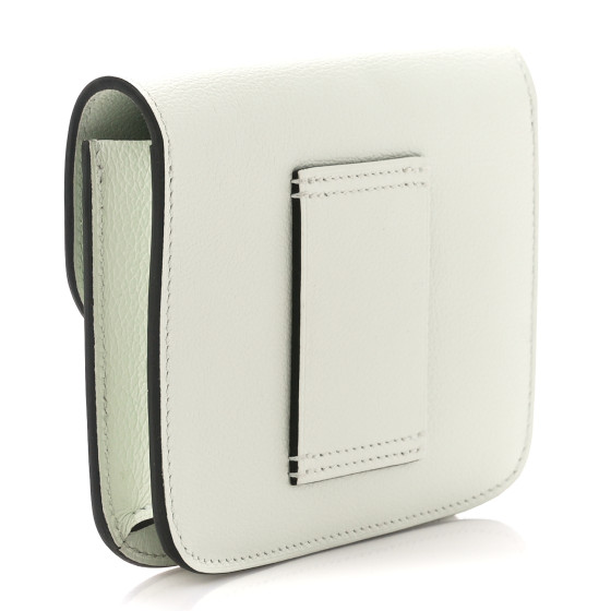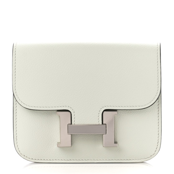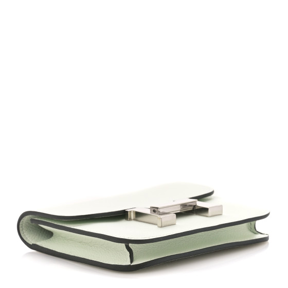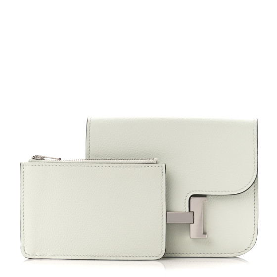 This is an HERMES Evercolor Constance Slim Wallet in Vert Fizz. This compact essential wallet is crafted of fine calfskin leather in green and features a frontal silver H that the front flap inserts through and opens to a cross-grain compact accordion style partitioned interior with card slots. It can be worn also as a belt bag.