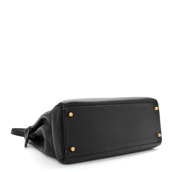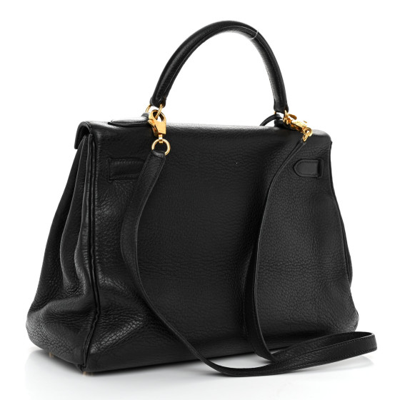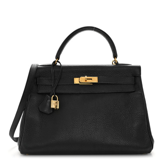 This is an HERMES Fjord Kelly Retourne 32 in Black. This Kelly handbag is crafted of richly textured bullcalf leather in black. The bag features a reinforced leather top handle, an optional leather shoulder strap, gold-plated hardware, and a clochette with keys for the padlock. This bag features a strap closure with a signature Kelly turn lock. The flap opens to a goatskin leather interior with zipper and flat pockets.