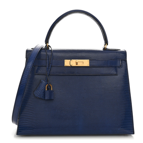 This is an authentic HERMES Lizard Kelly Sellier 28 in Bleu Saphir. This stunning vintage Kelly bag is crafted of fine blue lizard skin. It features a reinforced top lizard handle, a short frontal flap, polished gold plated hardware. The top flap opens to a matte blue leather interior with patch pockets. This collectible handbag is suitable for elegant occasions, from Hermes!