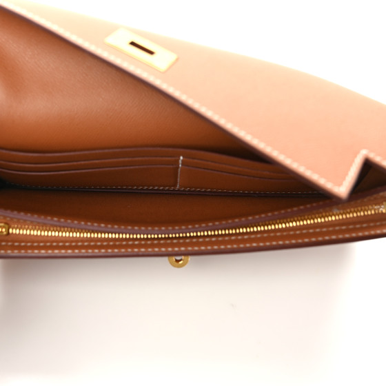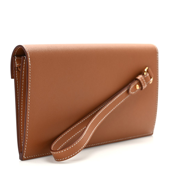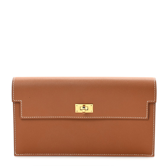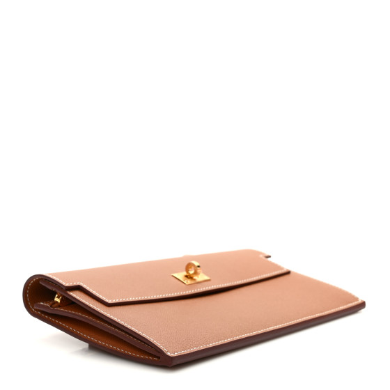 This is an HERMES Madame Calfskin Kelly Pocket Long Wallet in Gold. This wallet is crafted of stamped calfskin leather in golden brown with a removable wrist strap. The front flap opens with a gold plated Kelly turn lock to a matching leather interior with card slots, patch pockets, and a zippered compartment.