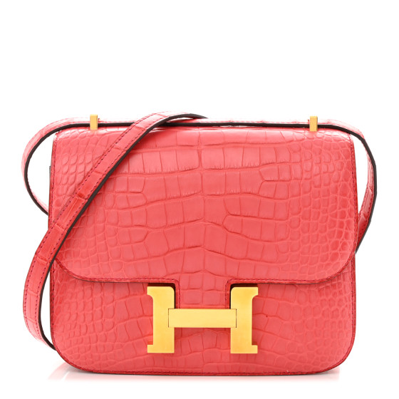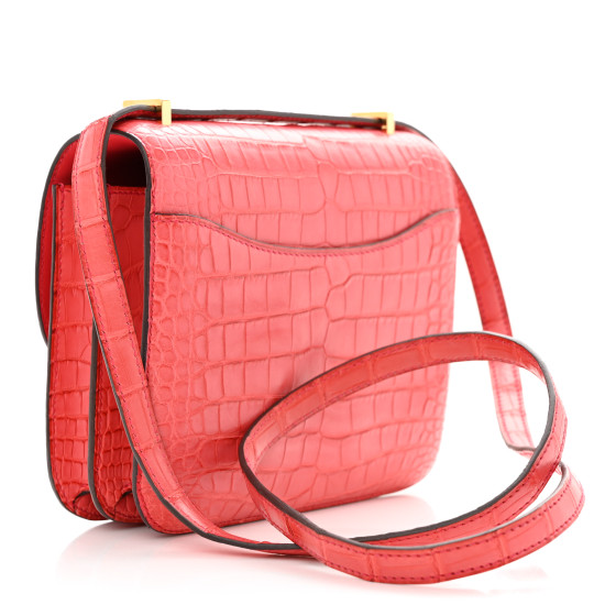 This is an HERMES Matte Alligator Constance 18 in Bougainvillea. This stylish shoulder bag is finely crafted of matte alligator leather in coral red. The bag features a long shoulder strap with gold-plated hardware including an H buckle at the flap. This opens to a compact partitioned leather interior with patch pockets.