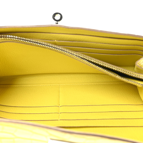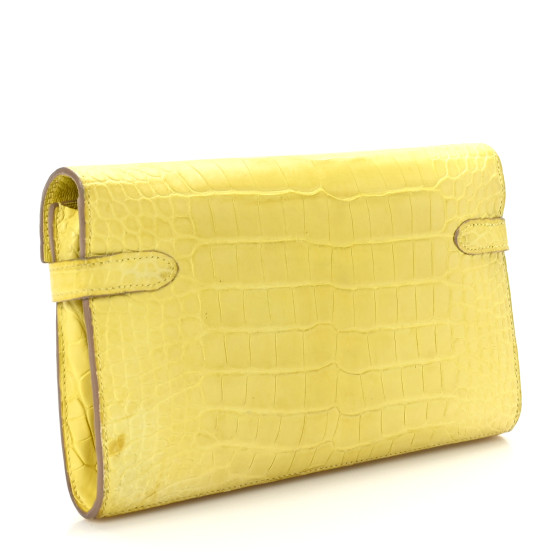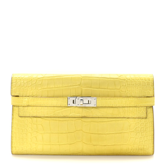 This is an HERMES Matte Alligator Kelly Longue Wallet in Mimosa. This clutch wallet is crafted of alligator skin in yellow and features a frontal flap with a Kelly strap and plated palladium turn lock closure. This opens to a partitioned leather interior lined with card slots, patch pockets and a zipper pocket with a faux cadena padlock zipper pull.