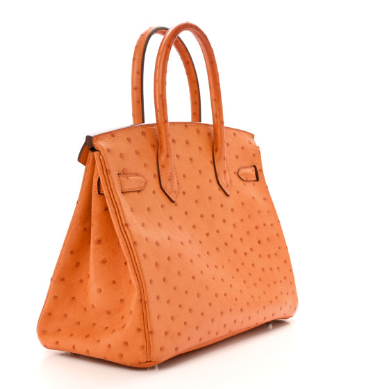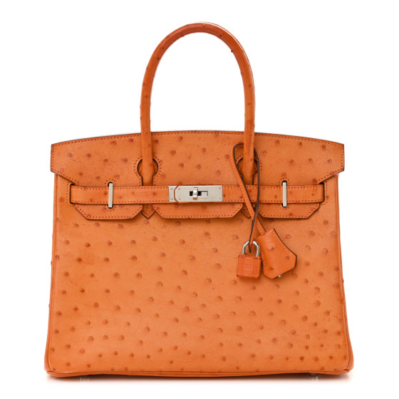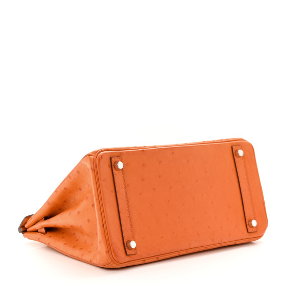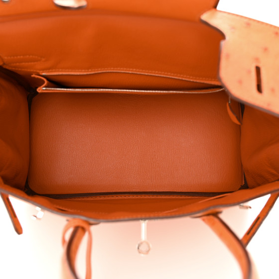 This is an authentic HERMES Ostrich Birkin 30 in Orange. This stunning Birkin is crafted of exotic ostrich leather in an orange. The bag features signature rolled leather handles, and polished palladium hardware. The short front flap secures with a strap and turn-lock closure, and opens to a matching leather interior with zipper and patch pockets.
