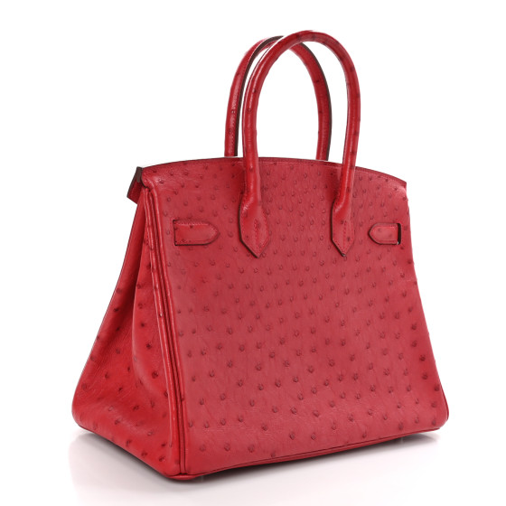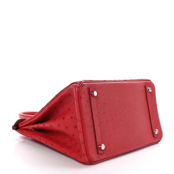 This is an authentic HERMES Ostrich Birkin 30 in Rouge Vif. This exquisite handbag is expertly handcrafted of exotic ostrich leather in red. The bag features rolled leather top handles, a frontal flap with a strap closure with palladium hardware, including a signature turn lock and padlock. The top flap opens to a matching leather interior with zipper and patch pockets.