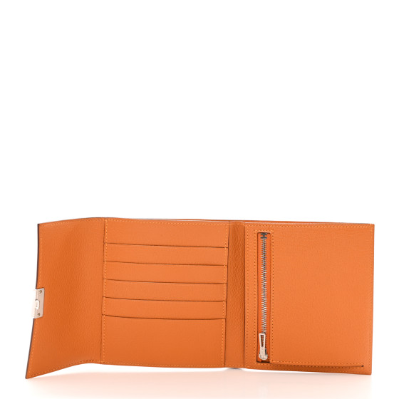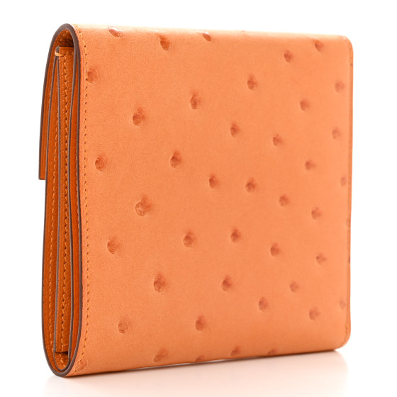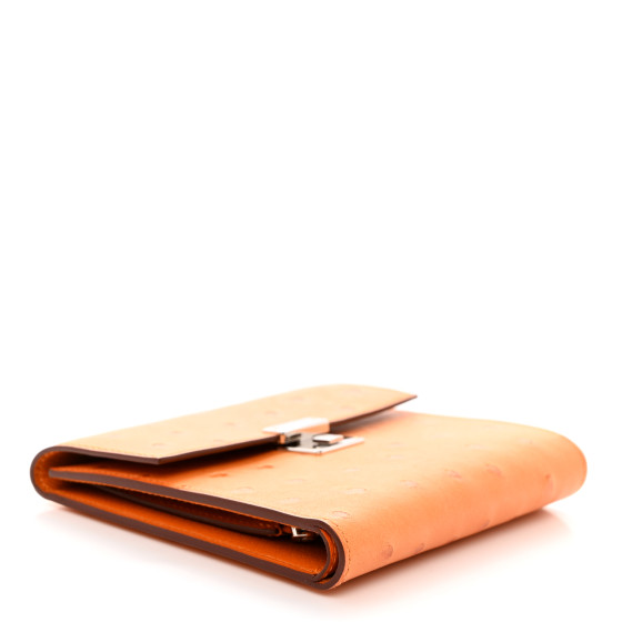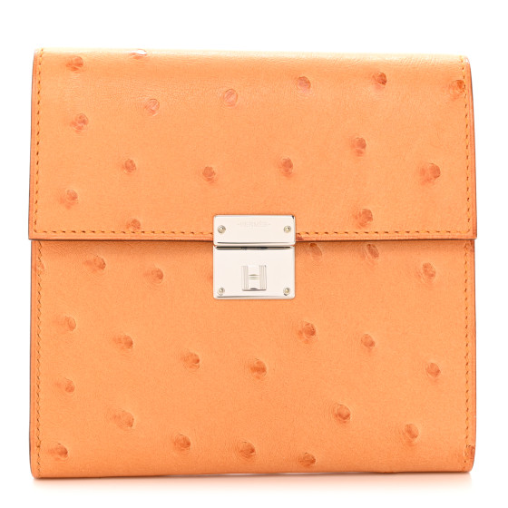 This is a HERMES Ostrich Clic 12 Wallet in Abricot. This chic wallet is crafted of ostrich leather with a frontal flap and palladium lock. This opens to a partitioned leather interior lined with card slots and patch pockets.