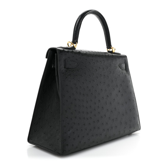 This is an HERMES Ostrich Kelly Sellier 28 in Black. This popular tote is crafted of ostrich leather in black. The shoulder bag features a top handle, a flap with a strap closure and gold hardware. The flap opens to a matching leather interior with zipper and patch pockets.