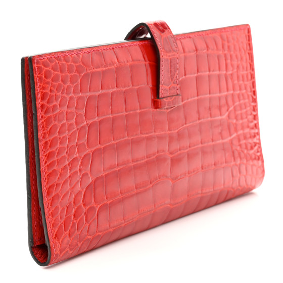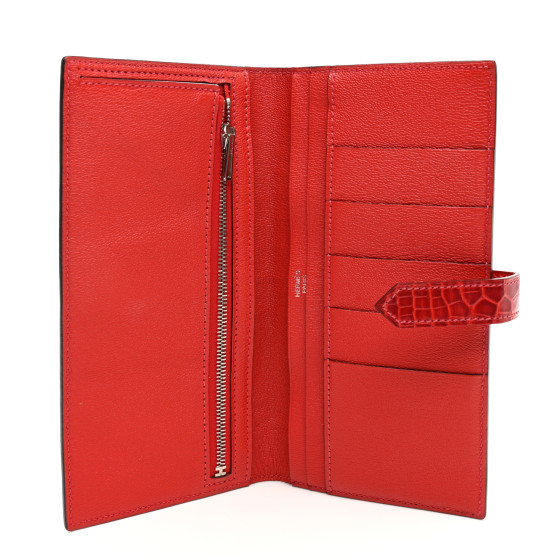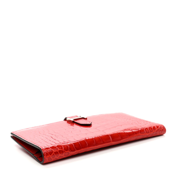 This is an HERMES Shiny Alligator Bearn Wallet in Geranium. This stylish wallet is beautifully crafted of shiny alligator leather in red. The wallet has a polished gold Hermes H that opens to a textured red leather interior with five card slots, billfolds, and a zipper panel.