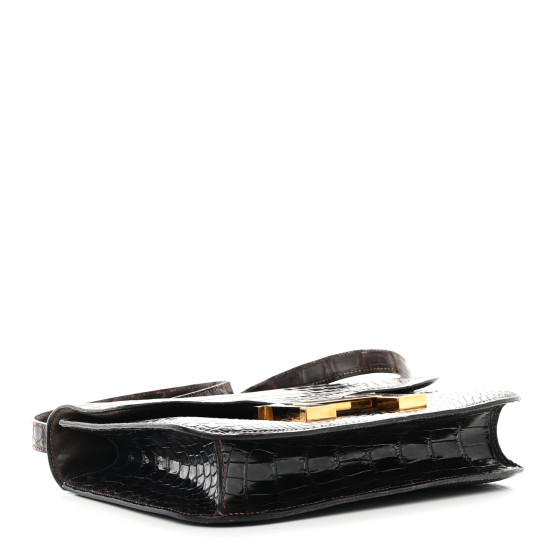This is an HERMES Shiny Niloticus Crocodile Constance 24 in Havane. This stylish shoulder bag is finely crafted of polished crocodile leather in brown. The bag features a long shoulder strap with an H buckle at the flap. This opens to a compact partitioned leather interior with zipper and patch pockets.