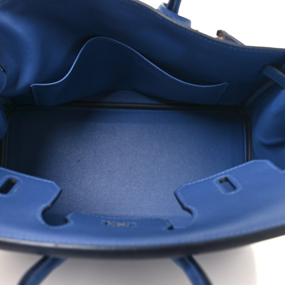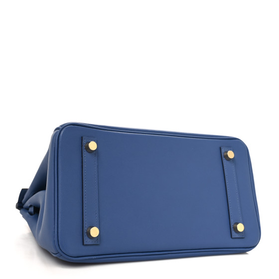 This is an authentic HERMES Swift Birkin 25 in Bleu Brighton. This classic handbag is beautifully crafted of supple swift leather in blue. The bag features rolled leather top handles, a frontal flap and strap closure and gold plated hardware including a turn lock, a padlock and keys in the hanging leather clochette. This opens to a matte leather interior with pockets.