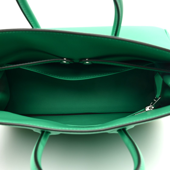 This is an authentic HERMES Swift Birkin Shadow 25 in Menthe. This tote is crafted of swift leather in bright green and features rolled leather top handles, a flat base with silver palladium hardware feet for protection. In lieu of the normal straps and lock, this leather is embossed with the silhouette of straps and a flap. The reverse side is embossed to resemble a hanging clochette. The top opens to a matching leather interior with zippered and flat pockets.