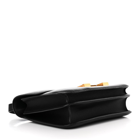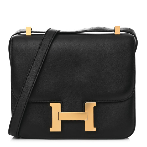 This is an HERMES Swift Constance 24 in Black. This shoulder bag is crafted of swift calfskin leather in black. The bag features a black crossbody strap with gold plated hardware including an H buckle at the front flap. The flap opens to a black leather interior with zipper and patch pockets.