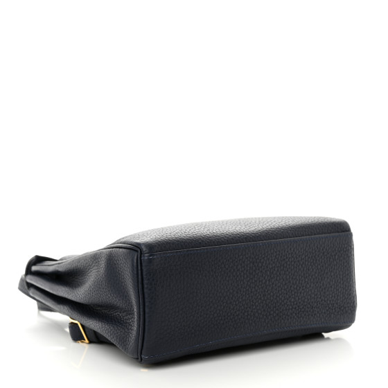 This is an authentic HERMES Taurillon Clemence Kelly Ado Backpack in Bleu Nuit. This chic Kelly backpack is crafted of durable, grained calfskin leather in blue. The bag features an adjustable leather shoulder straps and polished gold plated hardware. The turn lock and leather strap closure opens to a matching blue leather interior with a pocket.