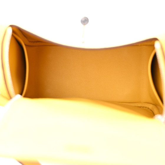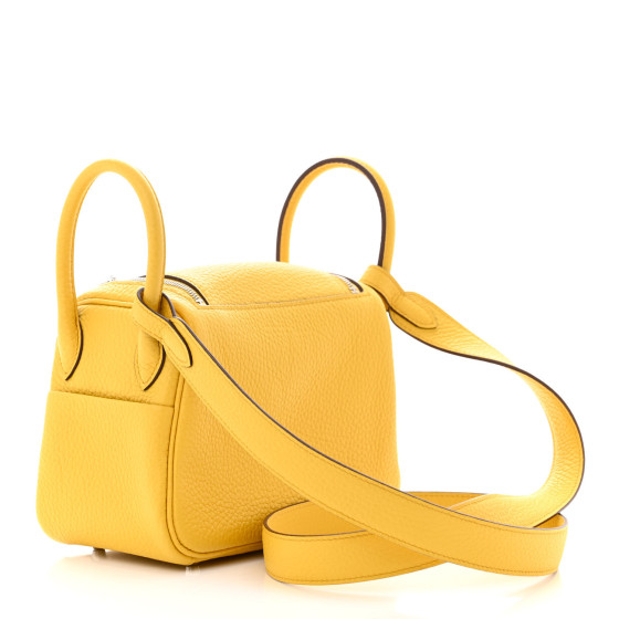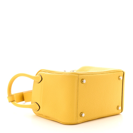 This is an HERMES Taurillon Clemence Mini Lindy 20 in Sun. This mini shoulder bag is crafted of calfskin leather in yellow. The bag features rolled leather top handles, connected with a looping shoulder strap and silver hardware. The top zippers open to a matching leather interior with patch pockets.