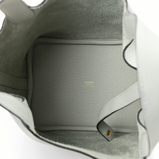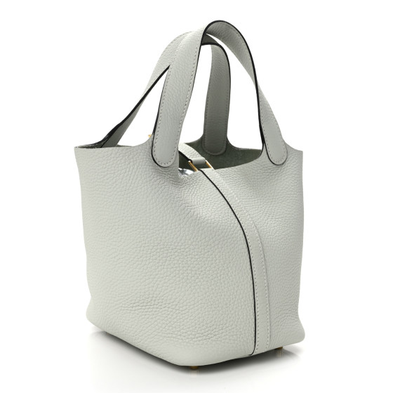 This is an authentic HERMES Taurillon Clemence Picotin Lock 18 PM in Gris Neve. This chic tote is crafted of textured calfskin leather in light grey. This bucket-style bag features a unique one-piece reinforced design with leather top handles and a closure strap that is secured by a polished gold padlock. This opens to a spacious beige suede interior with a leather base.
