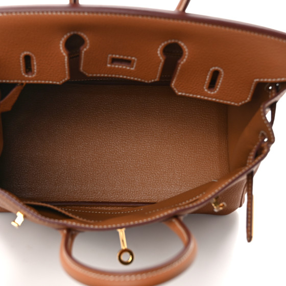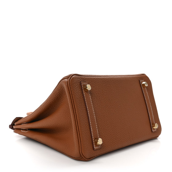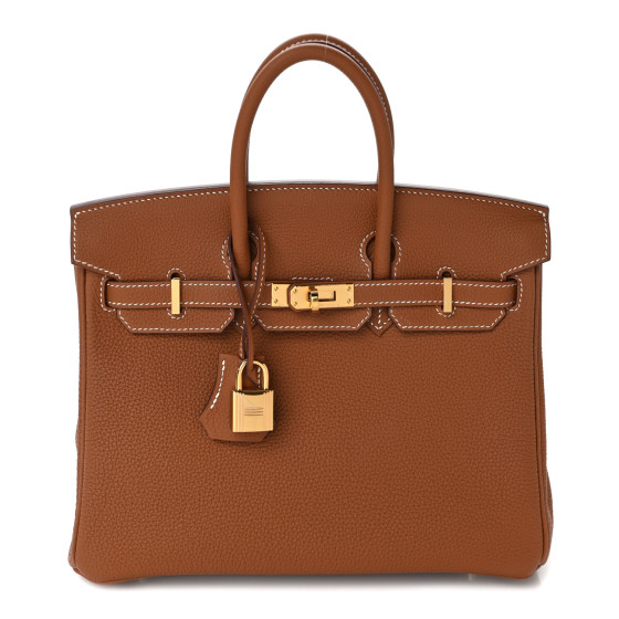 This is an authentic HERMES Togo Birkin 25 in Gold. This classic handbag is beautifully crafted of togo calfskin leather in golden brown. The bag features rolled leather top handles, a short front flap and strap closure, and gold-plated hardware including a padlock and keys inside a leather clochette. This opens to a goatskin leather interior with zipper and patch pockets.