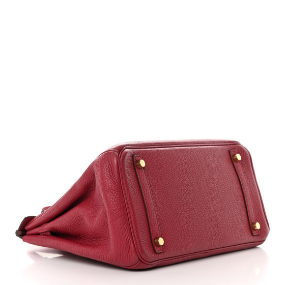 This is an authentic HERMES Togo Birkin 30 in Rubis. This stylish Birkin handbag is crafted of luxurious togo calfskin leather in red with a purple undertone. The bag features looping leather top handles, a cross-over flap, a strap closure, a gold plated turn lock, padlock and a hanging clochette with keys. This opens to a matching matte goatskin leather interior with zipper and patch pockets.